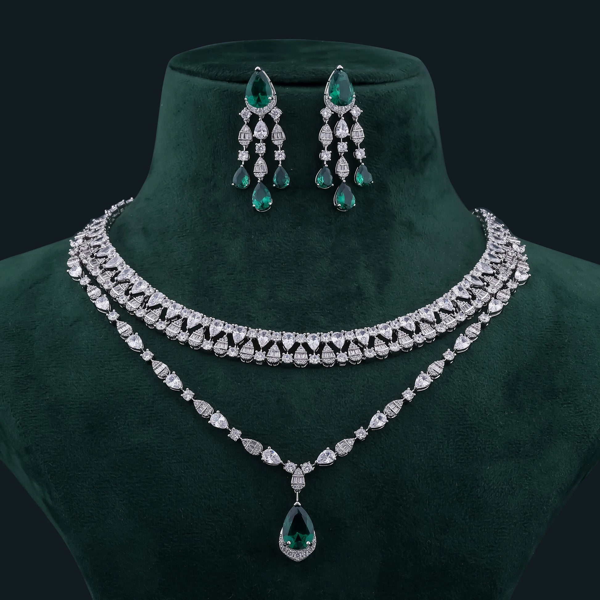 Grace your look with this sophisticated double-layer necklace set, designed with sparkling diamond-cut crystals and accented by striking emerald-green teardrop stones. The centerpiece pendant adds a touch of royal elegance, while the matching chandelier earrings complete the luxurious ensemble.