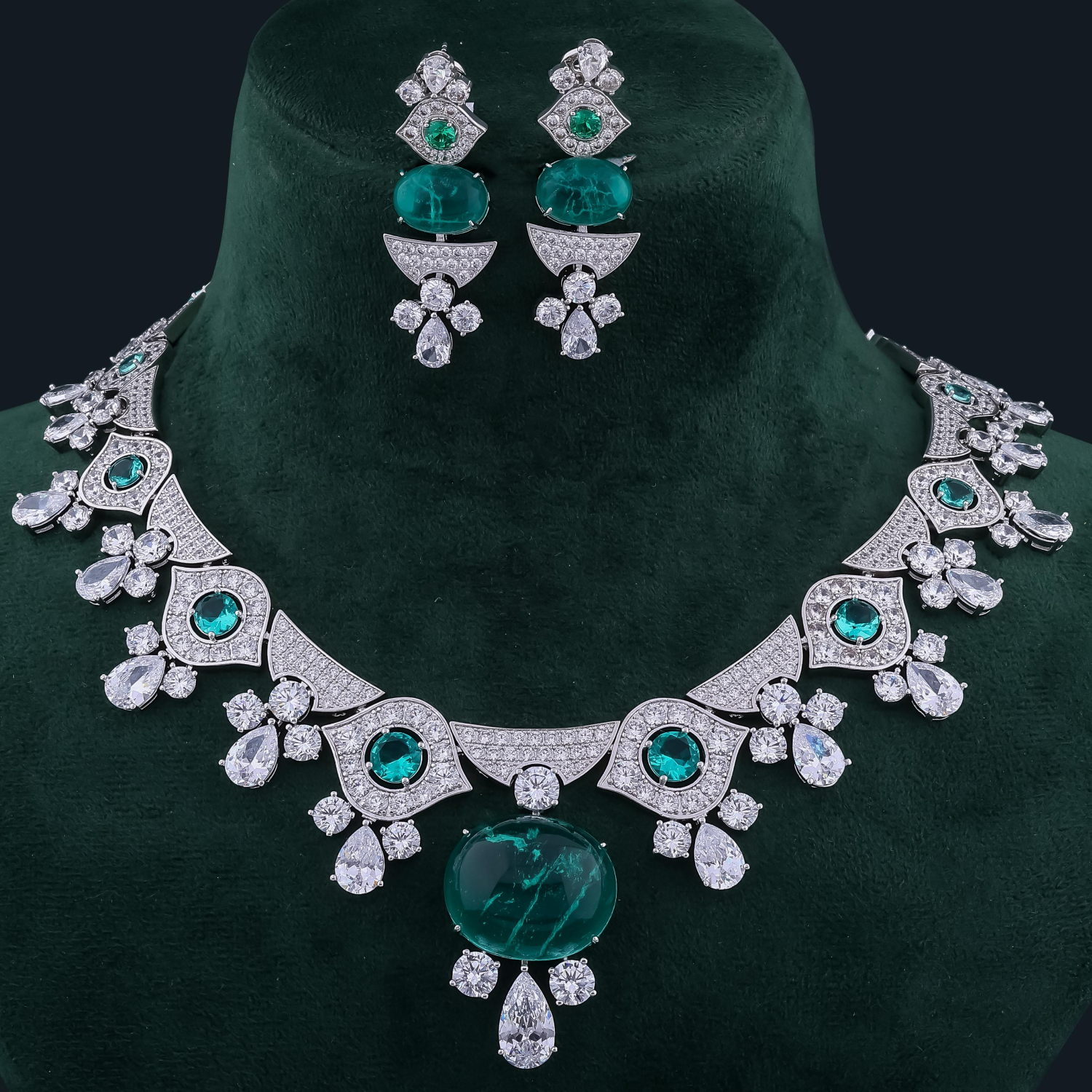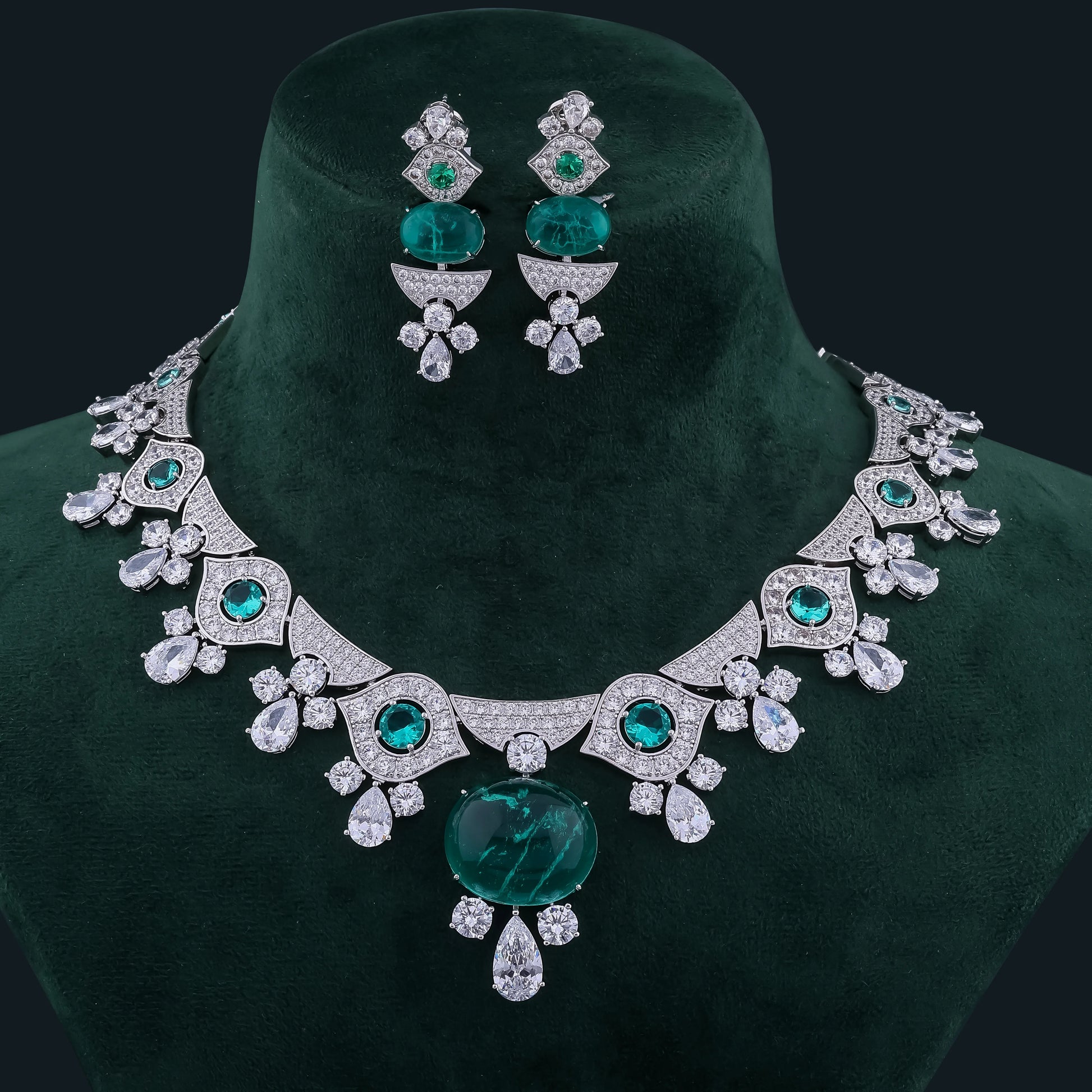 Elevate your style with this regal necklace set, featuring a magnificent oval emerald centerpiece surrounded by brilliant-cut diamonds. Smaller round emeralds and sparkling teardrop diamonds are beautifully arranged in an intricate design, paired with matching statement earrings for a complete royal look.