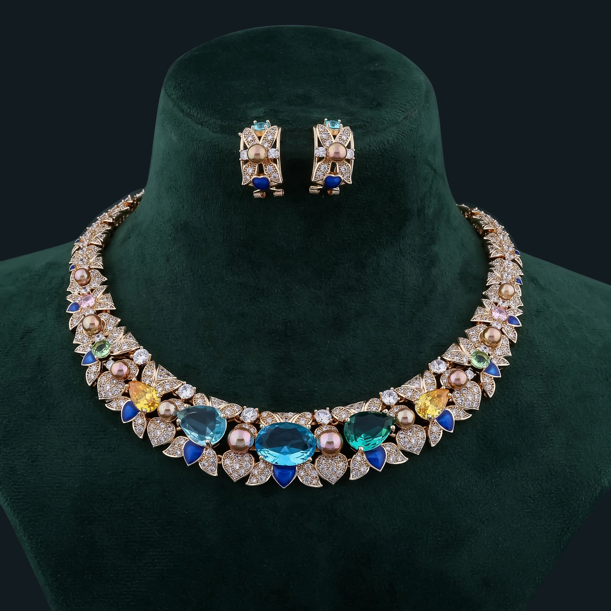 Step into luxury with this vibrant necklace set, featuring a stunning combination of sparkling gemstones, luminous pearls, and diamond-studded floral accents. The mix of ocean-blue, emerald-green, and sunshine-yellow stones creates a refreshing yet regal appeal. Paired with matching gemstone earrings, this set is a perfect balance of color and elegance.